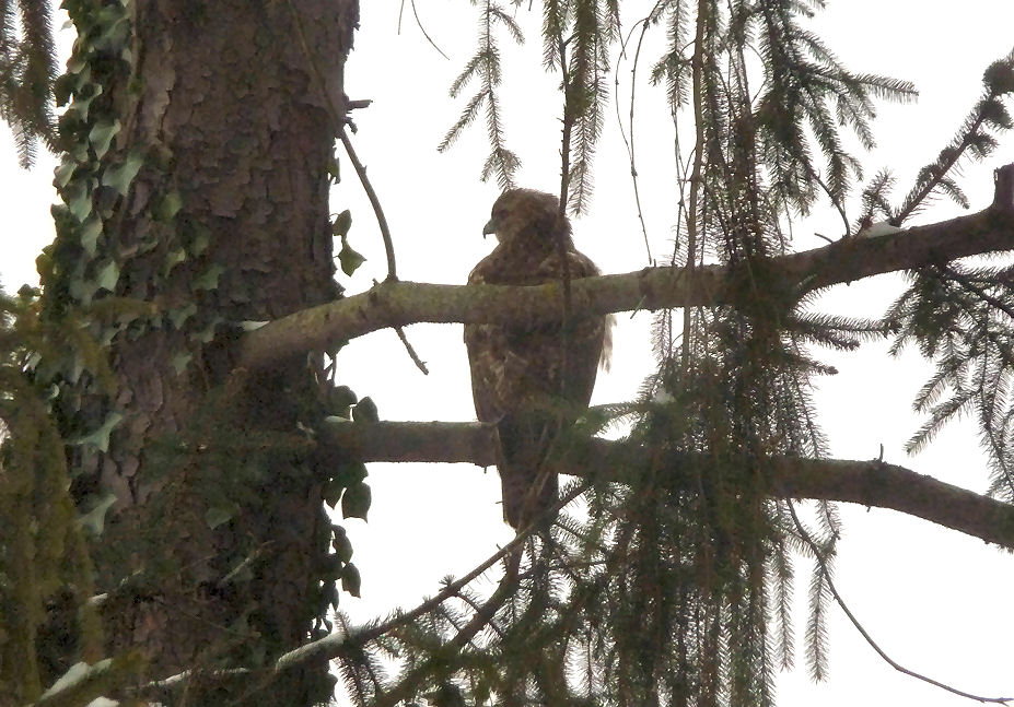(February 21) Today I was working on the desk in my livingroom where I can look out into our backyard. All of a sudden, a large hawk swooped down low across the window and then lit in the pine tree right in my line of vision. I could not believe my eyes as hawks don't usually come in our backyard at all. This was astounding insofar as had the hawk just landed in the tree, I might not have noticed it. But the way it swooped down into the yard right in front of my window was impossible to miss. This happened at around 2 pm and I called Mike over to see him. Ten minutes later it was still there and I jokingly said I wondered if it would stay until 3:17. Well, it didn't stay until 3:17 but when it DID fly off, I noticed the time and it was 2:17. Close enough! But that's not all ... two days later the exact same hawk came back and landed on the EXACT SAME BRANCH that he was on before. I took pictures of it both days and the pictures are identical. Here it is (be sure to click on the image to see a super close-up ... this bird is beautiful!).