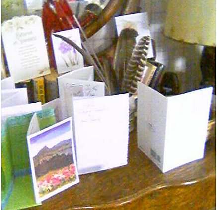 What an awesome day! Just a few minutes ago, I went downstairs and saw a feather -- almost 9" long! -- lying in the center of our kitchen floor. I called to Mike, who was in the family room next to the kitchen, and asked him if he'd seen it. He said when he returned from his walk a little bit ago, it was lying there in the middle of the floor. Since we do have feathers in Bryan's room, I wanted to be sure Moses hadn't sneaked in there and carried one down. I have them booby-trapped ... the vase of feathers is on Bryan's dresser in the center of a bunch of sympathy cards we had received, all standing up so that if the cat would ever jump up on the dresser, they would get knocked down. So up I went to see if Moses had, in fact, stolen the feather from there. As I suspected, the feathers were intact and the cards were all untouched ... there is absolutely no way the cat could have gotten to them: