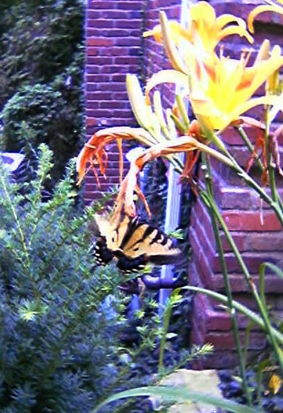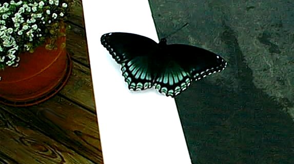 While Lori was here cleaning this afternoon, she went out to her car and on the way back in, a gorgeous swallowtail butterfly began flying around her. She called me out to see it and I grabbed my cell phone on the way. This was the exact same type of butterfly that Mike and I found last night on our walk only bigger. I was able to capture several videos and a picture of it before it flew away: