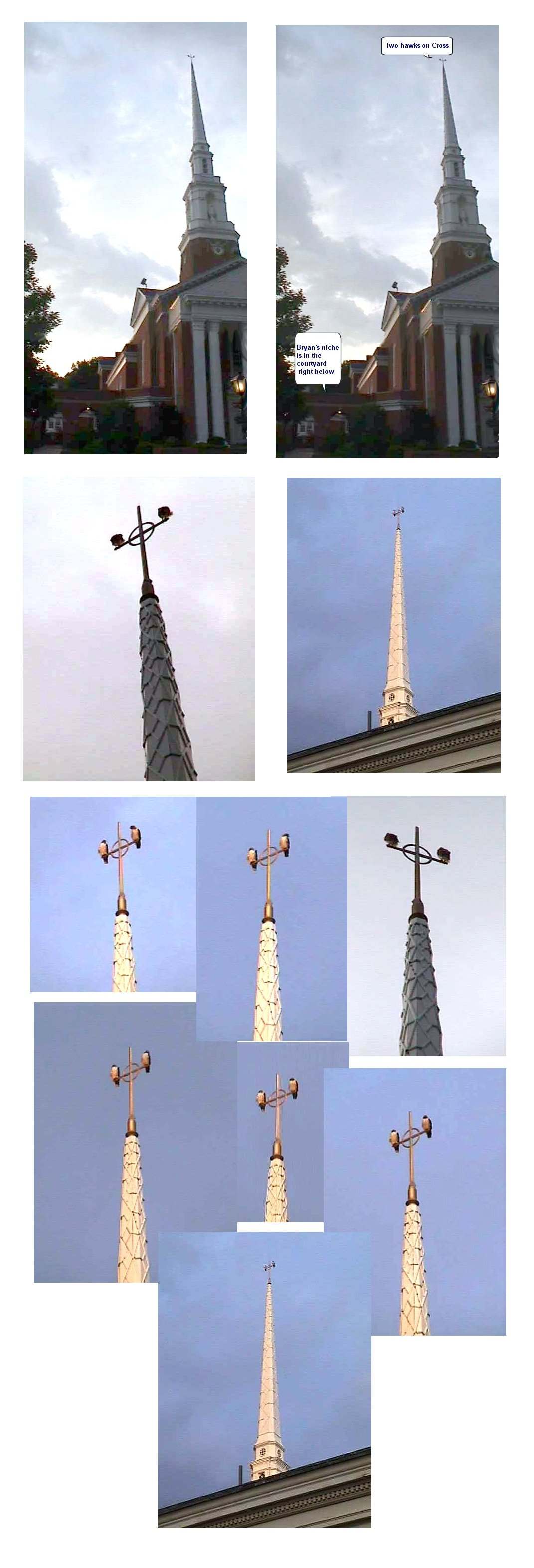 Tonight Mike and I went out to dinner after work and didn't get home till about 7:30. As I drove past the church, I saw the hawk on the steeple as soon as I rounded the bend. But to my amazement, as I got closer, I realized there was not ONE hawk on the steeple but TWO! One was on each side of the cross at the top. I pulled into the church parking lot and called Mike immediately on my cell as he was driving a bit behind me and I wanted to tell him. Well, I needn't have worried. His first words were, "Honey, I see the hawk!" I realized that he was still far enough away and didn't know there were two there. He ended up pulling into the parking lot as well and we both took pics with our cell phones. When we got home and looked at them, we were both disappointed with the lack of clarity. So I decided to grab my digital camera and go back to get better shots. I just knew Bryan would keep them there. Sure enough, both hawks were still sleeping atop the steeple. I took many pictures from both sides and one that shows the church steeple in relation to the courtyard where Bryan is buried. I can hardly believe it ... for 6 months, there has not been a hawk anywhere near that church and now they are showing up on the steeple cross almost every day. I just know it has to have something to do with Bryan. Hawks are a powerful symbol for him and a sign he is able to give us with apparent ease. It is truly a blessing for us!