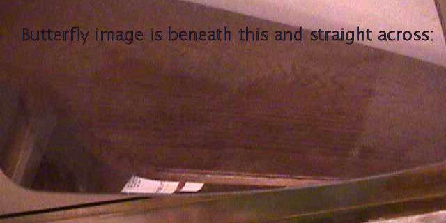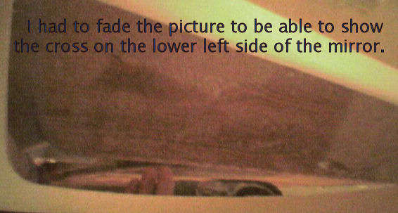 This morning I was in the bathroom and noticed that the last light in the fixture was out. I reached up and tapped it and tried to tighten it to make it light up but it did not. Assuming it was burnt out, I decided to leave it till later to replace as the other three were lit and I was about to get into the tub. Within minutes of my getting in the tub, the light blinked back on really bright ... much brighter than normal. I felt Bryan's presence and began "talking" with him ... telling him how much I wish he could be here with the pool going in. So much is going on in our back yard right now that he would be really enjoying it. The light blinked off and on several more times. Then I told Bryan something that I saw on TV the other night ... on Ghost Whisperer, a daughter who had passed wrote a message in the steam on a mirror to her father. I told Bryan that if he wanted to ever leave me a message on a mirror, I would love it and I would not be afraid. Our bathroom is mostly mirror ... the entire tub is surrounded from the tub to the ceiling with mirror. Then we have a large medicine cabinet with three mirrors on the door. And I have a free-standing mirror that I use when doing my hair. I suddenly "felt" Bryan telling me to look in the mirror. I looked all around and saw nothing ... then my eyes were drawn to the small free-standing mirror. I saw something on it but didn't pay too much attention until I "heard" Bryan telling me to look closer at it. When I turned my head, the image on the mirror was a butterfly! I couldn't believe my eyes. I wondered if the image was an aberration in the mirror glass itself or if the mirror was dusty ... I couldn't tell for sure. When I got out of the tub, I checked and it was a butterfly in the dust on the surface of the mirror! Wow! When Lori came over a bit later today, I showed it to her. She saw it right away and also pointed out a cross to the left of the butterfly. I had totally missed that! I took a few pictures of it with my digital camera ... pics are below (click on them to enlarge). It looked much clearer in person than the photo shows but, then again, I was photographing a dust image!